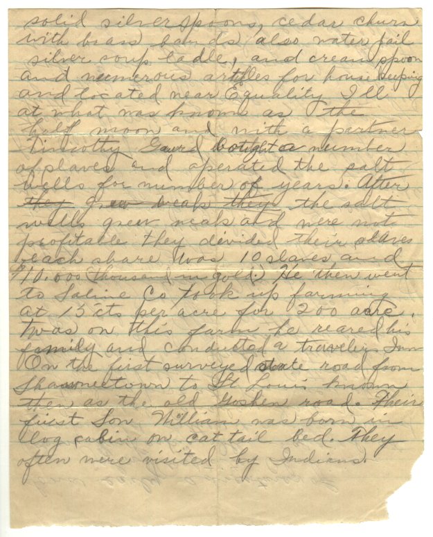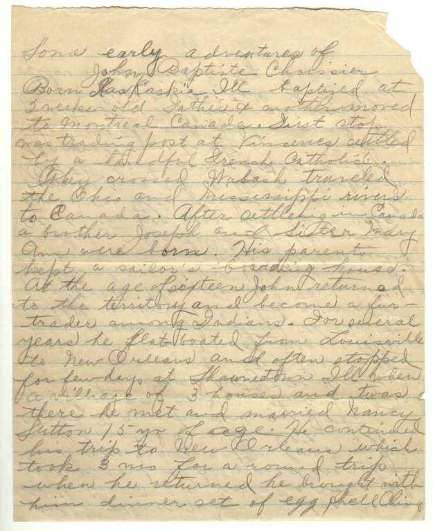 Born Kaskaskia Ill baptized at 2 weeks old. Father & mother moved to Montreal Canada. First stop was trading post at Vincennes settled by a handful French Catholics. They crossed Wabash traveled the Ohio and Mississippi rivers to Canada. After settling in Canada a brother Joseph and sister Mary Ann were born. His parents kept a sailor's boarding house. At the age of sixteen John returned to the territory and become a fur-trader among Indians. For several years he flat-boated from Louisville to New Orleans and often stopped for few days at Shawneetown Ill when a village of 3 houses and twas there he met and married Nancy Sutton 15 yr of age. He continued his trip to New Orleans which took 3 mo for a round trip. When he returned he brought with him dinner set of egg shell China, solid silver spoons, cedar churn with brass bands also water pail, silver soup ladle, and cream spoon and numerous articles for housekeeping and located near Equality Ill at what was known as the half moon and with a partner Timothy Guard bought a number of slaves and operated the salt wells for number of years. After the salt wells grew weak and were not profitable they divided their slaves each share was 10 slaves $10,000 (thousand in gold.) He then went to Saline Co took up farming at 15 cts per acre for 200 acre. Twas on this farm he reared his family and conducted a travelers Inn. On the first surveyed state road from Shawneetown to St. Louis known then as the old Goshen road. Their first Son William was born in log cabin on cat tail bed. They often were visited by Indians.