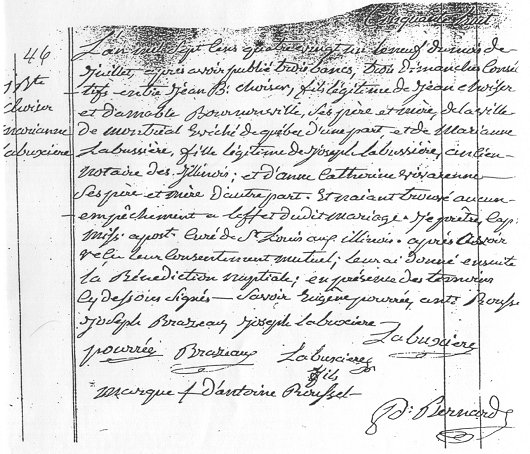 L'an mil sept cents quatre vingt un le neuf du mois de juillet, après avoir publié trois banes, trois dimanches consecutifs entre Jean B. Choiser, fils légitime de Jean Choiser et d'Amable Bournonville, ses père et mère, de la ville de Montréal, eveché de Québec d'une part et de Marianne Labussiere, fille légitime de Joseph Labussière au lieu notaire des Illinois; et d'Anne Catherine Vivarenne, ses père et mère d'autre part, et n'avant trouvé aucun empêchement a l'effet du dit mariage, je prêtre signé miss. apôt. curé de St. Louis aux Illinois, après avoir recu leur consentement mutuel; seurai ? donné ensuite la Bénediction nuptiale; en présence des tenires ? cy dessous signés - savoir ? Eugêne Pourrée, Antoine Roussel, Joseph Brazeau, Joseph Labussière.Labuxière